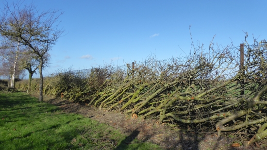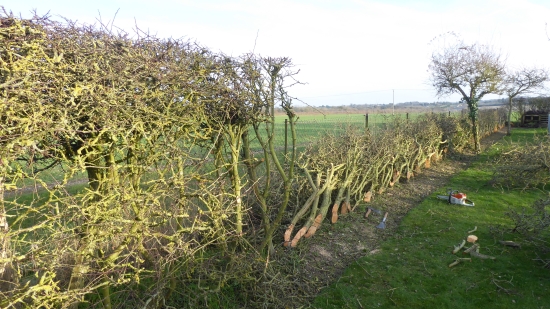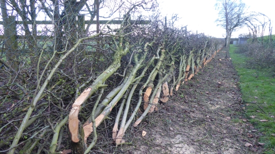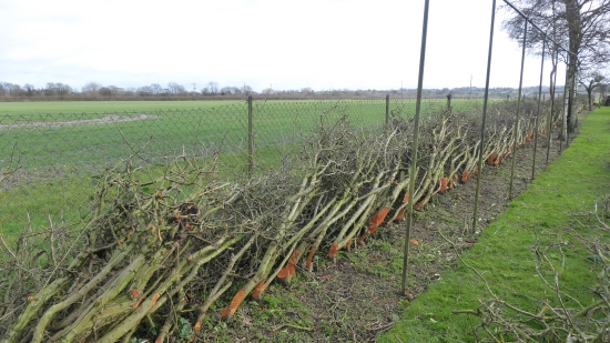 Buckland. 88 yards hawthorn garden hedge laid into adjacent wire mesh fence fence. No stakes or binders needed to create a sound laid hedge